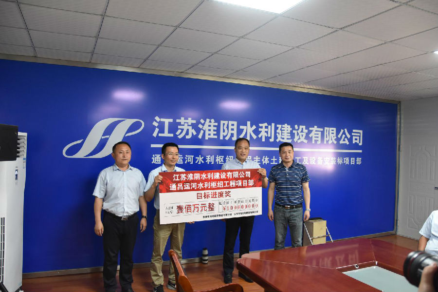 最后,莊總代表集團公司向通呂運河水利樞紐工程項目部頒發了5月30日水下驗收節點目標進度獎,獎金一百萬元整。尚超軍總經理代表水建公司及通呂樞紐項目部對莊總關心和支持工程建設表示感謝,并表示將把莊總的要求嚴格落實下去,現場要加大項目安全和質量管理力度,切實做好對職工的人文關懷和企業文化建設,在下一步施工建設中繼續保持壓力和專注度,向著下一個目標節點穩步前進,再創輝煌。